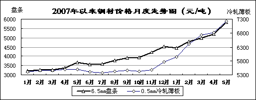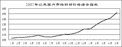 5月份,全國粗鋼產量同比增長10.5%,增速比上月加快0.3個百分點;鋼材產量增長13.6%,加快1.9個百分點。鋼材出口556萬噸,比上月增加78萬噸;進口2萬噸,與上月持平。鋼材價格漲勢不減。月末,國內市場鋼材價格綜合指數156.86點,比上月末上漲10.38點,比年初上漲31.74點,同比上漲43.52點。6.5mm盤條、10mm中板、0.5mm冷軋薄板平均價分別為5832元/噸、6702元/噸和7221元/噸,比上月末上漲12%、6.2%和6%,同比上漲59.1%、47.7%和31.6%。