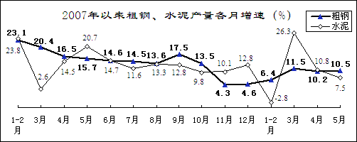 5月份,主要工業行業運行態勢較好。能源生產供應基本平穩,部分地區供需緊張狀況仍存在;冶金、有色、建材行業生產過快增長情況得到遏制;機械、電子行業繼續較快增長;紡織、輕工等行業出口增幅有所回升。前5個月,行業效益水平出現分化。煤炭行業利潤增長97.8%;冶金、建材、醫藥行業利潤增速超過40%;機械、電子和輕工行業利潤增幅27.1%-36.9%;有色、紡織行業分別增長9.2%和3.5%;電力、石化行業利潤下降。