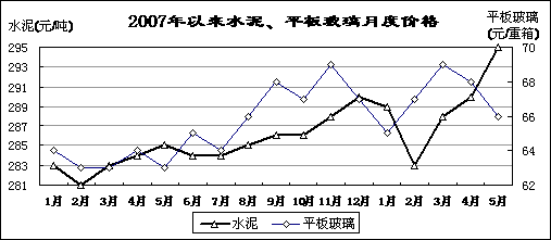 5月份,全國水泥產量同比增長7.5%,增速比上月減緩3.3個百分點;平板玻璃產量增長14.3%,加快7.2個百分點。水泥價格上漲較多,平板玻璃價格回落。當月重點建材企業水泥平均出廠價295元/噸,比上月上升5元/噸,同比上升10元/噸;平板玻璃出廠價66元/重量箱,比上月回落2元/重量箱,同比上升3元/重量箱。