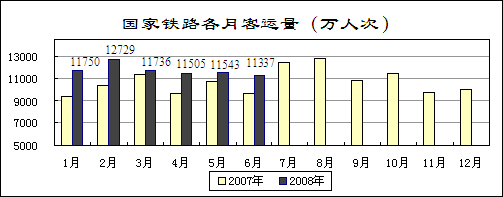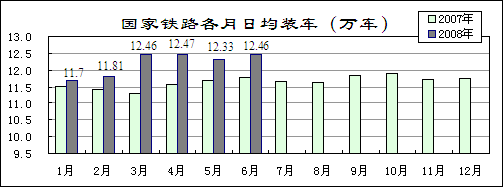 鐵路積極搶險抗災,保證重點物資運輸。今年接連發生的重大自然災害給鐵路運輸造成嚴重影響。鐵路部門積極搶險抗災,恢復運輸秩序,在保證救災物資運輸的同時,先后組織搶運電煤、化肥和東北糧食,加強重點物資運輸。上半年,全國鐵路日均裝車146611車,同比增長5.3%;完成貨運量16.52億噸,增長7.1%,其中煤炭運量增長11.6%。國家鐵路日均裝車122061車,增長4.8%。完成貨運量13.79億噸,增長6.4%。其中,煤炭運量6.68億噸,增長10.4%;糧食運量增長19.3%,石油、棉花、化肥農藥運量分別下降2.7%、12.6%和4.8%。