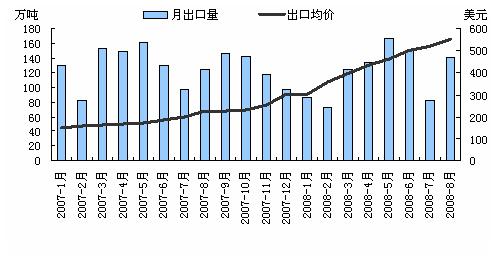 據國家海關最新統計:8月份我國出口焦炭141萬噸(詳見圖132),較7月份增加43萬噸,去年8月份出口量增加了13.7%,出口金額7.8億,焦炭均價達550美元/噸。