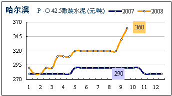 進入9月下旬后市場需求非常不錯,各企業發貨量大幅度增加,導致水泥價格也跟隨上調價格,截止10月22日哈爾濱水泥市場價格達到今年以來最高的價格360元/噸。引用牡丹江水泥股份銷售部楊經理的一句話“市場一片大好,水泥根本不愁賣”。