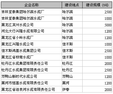 截止2008年10月中旬據新型干法水泥熟料生產線統計,見下表黑龍江省共有13條生產線,位于哈爾濱地區有5條;佳木斯3條;牡丹江2條;雙鴨山、黑河、伊春各1條。另外亞泰5000噸水泥熟料生產線明年將會投產。
