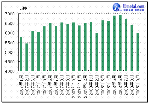 據最新統計限制,2008年9月中國生鐵產量3754萬噸,比8月的4004萬噸下降6%,全國9月日均生鐵產量125萬噸,是2007年3月以來17個月的最低點,與2007年9月相比則下降幅度達到7%,是繼8月首次負增長之后,連續第二個月負增長,且產量縮減幅度增加。