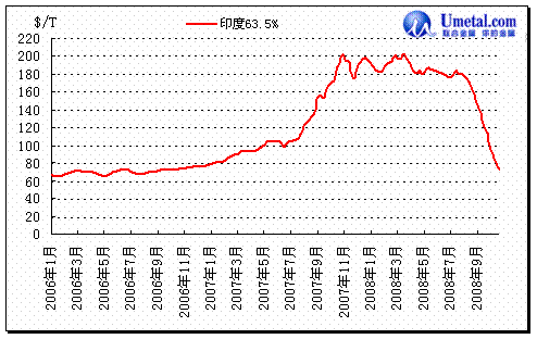 因此雖然9-10月鐵礦石市場經歷了雪崩式的暴跌,但這并不意味11-12月市場供需面將因此改善,相反供大于求的問題可能愈加嚴重。近期進口鐵礦石現貨市場人心渙散價格繼續下滑,成交量幾乎為零。現貨市場63.5%印度粉礦到岸價格已跌至70-73美金/噸,比08年3月最高點時跌幅75%,而較長期合同的澳大利亞礦價格低24%。