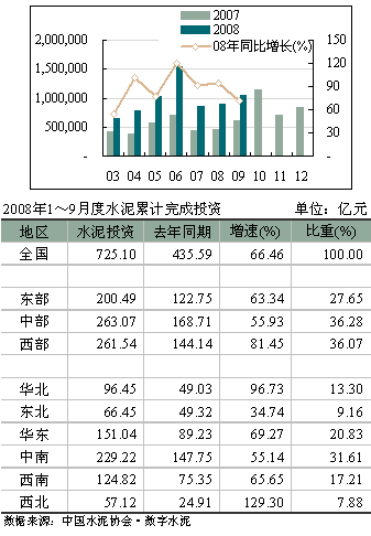 從六大區域看,西北地區受國家政策的影響,成為水泥投資增速最快的地區,1~9月水泥累計同比增長129.30%,但基數仍然較小,僅占全國比重的7.88%;