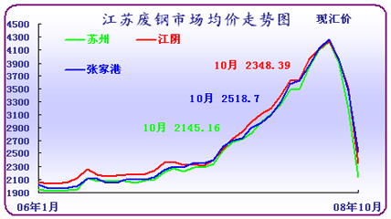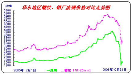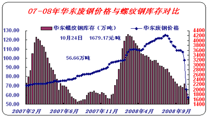 圖3可見,今年十月份國內(nèi)廢鋼價格跌幅十分驚人,已經(jīng)降至06年3月份水平,因廢鋼產(chǎn)品特性,不屬于生產(chǎn)類型,故影響市場多在心態(tài)上,鋼廠面對逐日下降的鋼材價格,必定大幅度打壓廢鋼價格,而直接共給鋼廠資源的經(jīng)銷商,除了考慮利益、還要考慮風(fēng)險,價格下壓程度更令人難以接受,成交量開始萎縮。