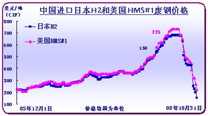 10月份國際廢鋼市場跌幅超過中國,粗略統(tǒng)計,國內(nèi)廢鋼價格月末較月初跌幅46.3%,而國際市場,日本H2號廢鋼CIF到中國主要港口跌幅58%,美國破碎料CIF到中國主要港口跌幅42.5%,報價230美元/噸,但實際成交價格已經(jīng)在200美元/噸以內(nèi)。