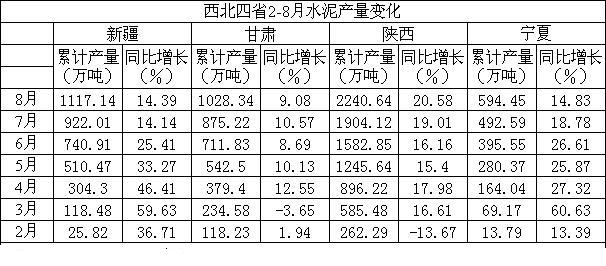 相比固定資產投資增速的穩步提升,西北水泥的產量投放卻并沒有同步躍進。數字水泥網統計顯示,今年2-8月份新疆、甘肅、陜西、寧夏四省的水泥產量月度平均增幅分別為32.85%、7.04%、13.15%和26.77%。除新疆水泥產量的釋放月度增幅高于當地固定資產投資增速外,寧夏、甘肅、陜西三省水泥產量月度增速與固定資產投資月度增速中存在著最高25個百分點的增幅缺口。