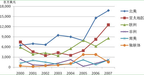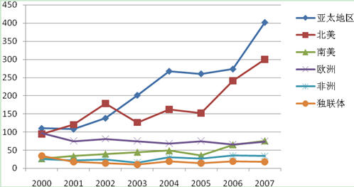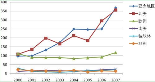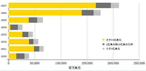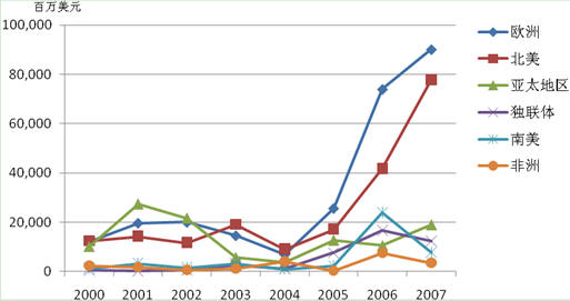 從并購數(shù)量上看,2000年到2007年間亞太地區(qū)增長最快,從97個增加到368個,增長率為279%;其次是北美,從108個增加到356個,增長率為230%。