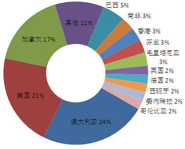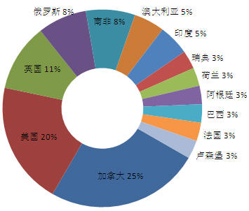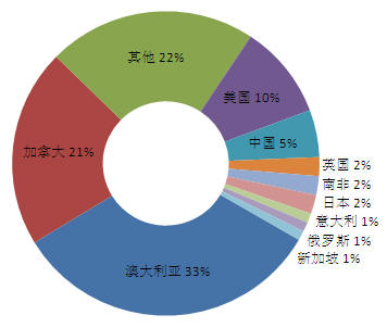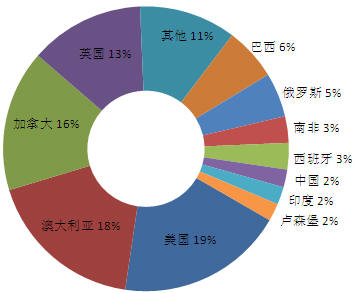 2007年,交易額在2億美元和10億美元之間的并購有64個,總計287億美元。并購目標(biāo)國家主要有澳大利亞、美國和加拿大,其中,澳大利亞占交易數(shù)量的24%,共16個,交易額64億美元;美國14個,占21%,交易額62億美元;加拿大11個,占17%,交易額58億美元。并購國家中,美國、澳大利亞和加拿大仍然占據(jù)前三位,其中,美國13個,占19%,交易額54億美元;其次是澳大利亞,12個,占18%,交易額44億美元;加拿大10個,占16%,交易額52億美元。