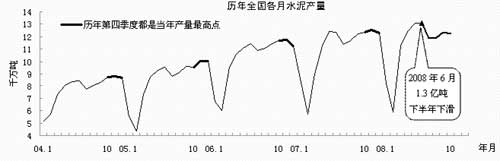 1-10月份,中西部地區水泥產量分別比去年同期增長9.1%和9.7%,東部地區下降1.9%。截止到10月末,今年全國停產的水泥企業478家,減少水泥產量4309萬噸;減產企業2249家,減少水泥產量1.04億噸,減產幅度19.9%。停產和減產主要是中小水泥企業。根據中國建筑材料聯合會監測統計,新型干法企業和60萬噸以上粉磨站1-10月份水泥熟料產量5.23億噸(含其他熟料,下同),比去年同期增長10.3%,增長速度比全國平均水平高9.5個百分點;水泥產量6.45億噸,比去年同期增長10.2%,增長速度比全國平均水平高6.6個百分點。不過,今年水泥重點監測企業的產量增長也在逐月下滑,一季度重點監測企業水泥產量比去年同期增長13.9%,二季度增長10.8%,三季度下降到8.4%,10月份只比去年同月增長5.1%。