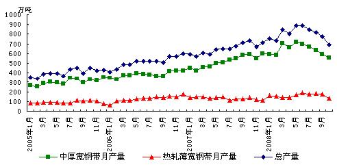 2008年1-10月份我國共生產熱軋薄寬鋼帶(即厚度小于3mm、寬度大于等于600mm熱軋卷材)1775萬噸,同比增加226.65萬噸,同比增長14.6%。其中10月份共生產熱軋薄寬鋼帶134.69萬噸,較9月份減少42.79萬噸,環比降幅達到驚人的31.79%;同比減少36.38萬噸,同比降低21.3%。從圖1中可知,熱軋薄寬鋼帶產量在今年6月份達到189.03萬噸的單月歷史最高產量后,一直保持著170萬噸以上的單月產量水平,而10月份產量已快速回落至今年3、4月份的低水平。