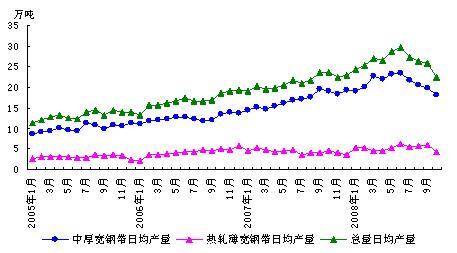 日產量上,我國熱軋板卷單日產量也有較大幅度的降低。其中10月份中厚寬鋼帶日均產量18.03萬噸(詳見圖2),較9月份減少1.77萬噸,環比下降9.82%;10月份熱軋薄寬鋼帶日均產量4.34萬噸,較9月份減少1.58萬噸,環比下降36.41%,下降勢頭比較迅猛。
