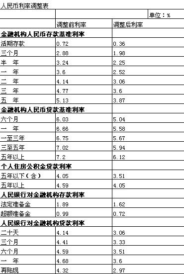 從2008年11月27日起,下調金融機構一年期人民幣存貸款基準利率各1.08個百分點,其他期限檔次存貸款基準利率作相應調整。同時,下調中央銀行再貸款、再貼現等利率。