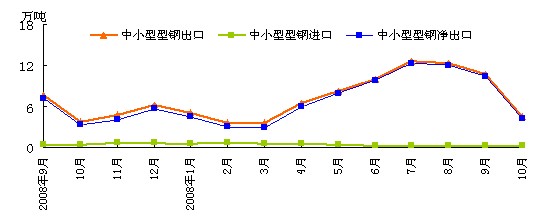 10月份中小型型鋼出口量是4.49萬噸,同比增長18.47%,較9月份出口量10.75萬噸減少6.26萬噸,環比下降58.23%(如圖2所示)。