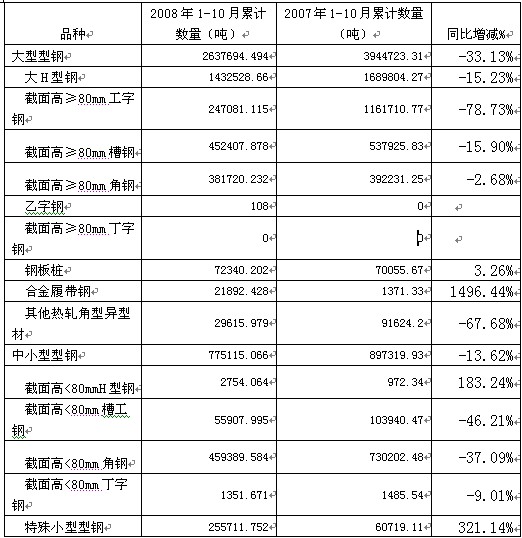 從各品種出口情況來看,今年出口增幅最大的是合金履帶鋼,其次為特殊小型型鋼、中小型規格H型鋼,其他的品種累計出口量同比基本均出現回落的態勢。統計數據顯示,2008年國內角型材進口變化不大,出口則已出現大幅減少,而且從目前企業的出口接單情況來看,后兩個月出口還將繼續減少。