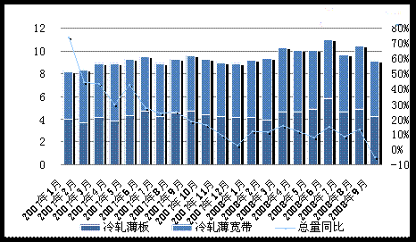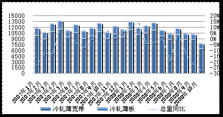 據(jù)最新統(tǒng)計(jì)數(shù)據(jù)顯示,10月冷軋板卷產(chǎn)量為258.1萬噸,同比下降10.2%,環(huán)比則有下降5.7%。為2007年3月份以來的最低水平,并較產(chǎn)量峰值(6月份的329萬噸)減少了71萬噸,下降了近23個(gè)百分點(diǎn)。具體來看,冷軋薄寬帶產(chǎn)量下降較為明顯,當(dāng)月產(chǎn)量為133.6萬噸,同比下降12.4%,環(huán)比降幅則為9.1%。