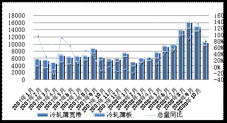 國內(nèi)外經(jīng)濟(jì)形勢的變化導(dǎo)致用鋼行業(yè)需求銳減,進(jìn)出口貿(mào)易量下降,市場價(jià)格持續(xù)大幅回落,部分冷軋鋼廠在10月繼續(xù)限產(chǎn)。受此影響,10月冷軋板卷資源供應(yīng)量同比下降17.6%,連續(xù)兩個(gè)月出現(xiàn)負(fù)增長,并創(chuàng)下26個(gè)月來的新低,僅為250萬噸。1-10月冷軋板卷累計(jì)資源供應(yīng)量則為2997萬噸,較去年同期的2911萬噸增加3個(gè)百分點(diǎn)。