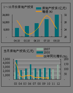 各省市情況:1~10月份,全國大部分地區累積房地產投資同比增速在平均水平以上,但房地產投資大省已經出現回落,如房地產投資仍居全國房地產投資額首位的江蘇省,但從1~10月份累積投資額增速看,僅居全國中等水平,10月份當月房地產投資仍保持正增長,是全國僅有的8個環比投資增加的省市之一;北京受奧運會影響,1~10月份的房地產累積投資額為全國同比唯一負增長的地區,10月份的房地產投資額環比增加了59.72%。