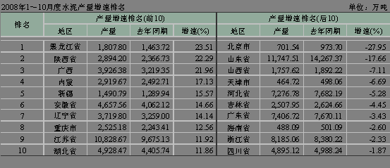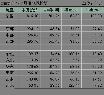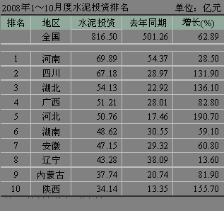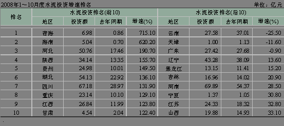 河北省受曹妃甸開發等因素拉動,水泥投資勢頭迅猛,1~10月份累積水泥投資額達到了50.76億元,同比增長190.70%,排名第三。