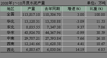 從1~10月份水泥累計產量看,為113,817.10萬噸,同比增長僅3.00%。華北、華東地區甚至出現負增長,華北為-3.09%,華東為-0.99%。