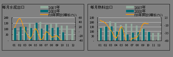 受金融危機的影響,全球經濟增長放緩,對水泥需求減緩,影響水泥產品的出口。10月份的水泥出口量進一步減少,僅為68.15萬噸,環比下降39.71%,同比下降46.94%,較9月份下降近26個百分點;水泥熟料出口91.81萬噸,環比下降26.93%,同比下降5.17個百分點。