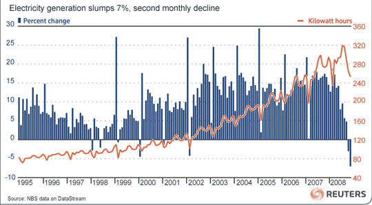 發電量下降的部分原因,可能是因為今年11月反常的溫暖氣候,以及金融危機對高耗能產業的沖擊,但分析師認為,這顯示中國經濟狀況正趨惡化,雖然中國正努力維持經濟增長。
