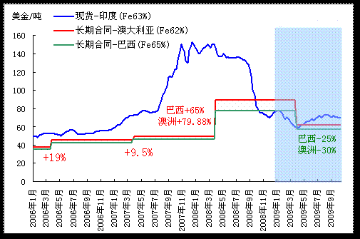 我們預(yù)期2009年長(zhǎng)期合同鐵礦石價(jià)格跌幅為25%(巴西)30%(澳大利亞)之間,澳大利亞和巴西鐵礦石離岸價(jià)格分別為62.5美金/噸和57.7美金/噸,略低于現(xiàn)貨鐵礦石價(jià)格。
