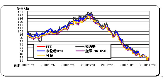 亞洲原油現貨市場:阿聯酋降低1月份和2月份合同原油供應量。沙特阿拉伯是市場目前的關注焦點,其在宣布減少1月船貨供應量7-10%后,還未通知客戶2 月合約供應情況。2月份交貨的中質和重質高硫原油已經全部售罄,因而輕質高硫原油受到市場青睞。然而日本等國終端用戶降低煉油廠開工率,限制了市場需求。阿曼新聞機構-ONA援引該國石油部長的話報道,2009年阿曼將其石油日產量從每天79萬桶提高到80.5-81萬桶。估計馬來西亞塔皮斯原油12月合約供應的官方售價為每桶41.71美元,比前一個月每桶下跌16.65美元。