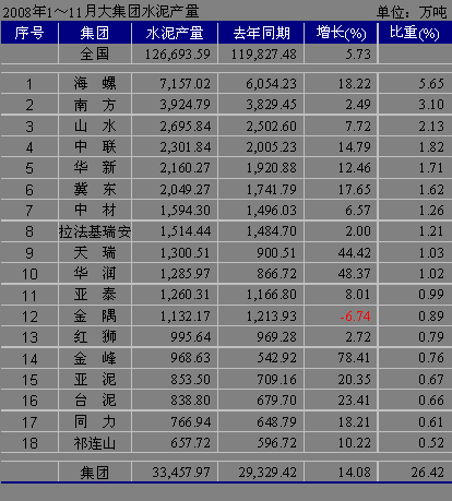 2008年1~11月全國水泥大集團水泥產量統計
