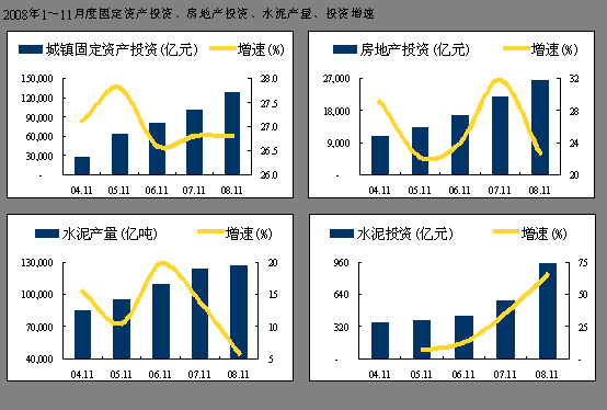 受國際金融風暴在下半年影響深化,從前11個月的數據來看,我國固定資產投資增速繼續回落:2008年1~11月份,共完成固定資產投資127,614億元,同比增長26.80%,名義增長率與2007年基本持平 (若扣除原材料成本上漲因素,投資增速要低于2007年同期)。其中房地產投資回落幅度明顯,1~11月份投資26,546億元,同比增長22.72%,較2007年同期增速下降了9.1個百分點。
