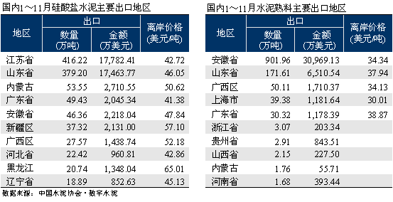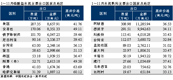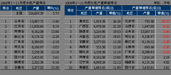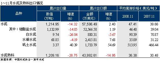 金融風暴在全球愈演愈烈,世界經濟衰退,出口表現最為明顯。我國水泥出口的主要國家,如美國、俄羅斯等國的經濟均受到巨大動蕩,對水泥的出口需求減弱。截止2008年1~11月,水泥、熟料比2007年同期都有所下降,熟料出口大幅下跌,同比減少達28.75%,水泥出口同比減少14.32%。