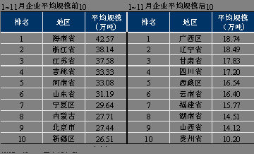 但區域內具有極大分化:華東的浙江、江蘇和山東三省入圍前10,而福建省的平均規模卻為全國倒數第四位;中南的海南平均規模居全國首位,河南為第4位,而廣西、湖南、山西的平均規模在全國排名后10之列;華北、西北企業平均規模較大,內蒙古、北京,寧夏、新疆入圍前10;西南地區企業平均規模普遍較小,除重慶外,四川、西藏、云南、貴州四省均進入全國平均規模后10。