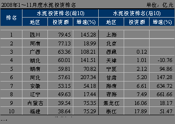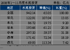 由于2006和2007年水泥市場偏暖,使2008年水泥投資持續走高。1~11月水泥產業投資完成942.14億元,同比增長65.05%。