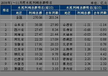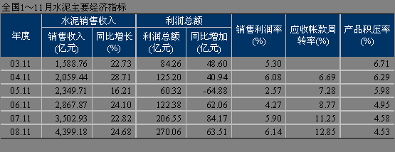 1~11月,全國水泥利潤總額創歷史新高,達到270.06億元,超出2007年同期64.52億元,同比增長31.39%,大大高于銷售收入漲幅,產業盈利繼續向好。