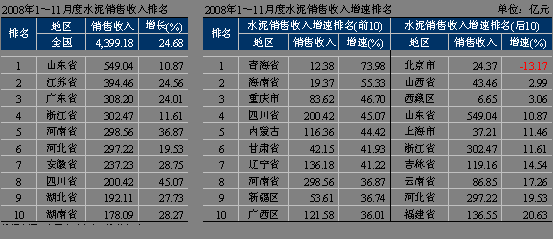 1~11月,水泥產業實現銷售收入4,399.18億元,同比增長24.68%,較2007年提高2個百分點。除北京由于奧運影響,是各省市中唯一的銷售收入負增長區,其他的省份的銷售收入均出現不同幅度的提高。
