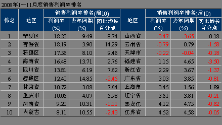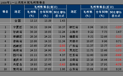 1~11月全國水泥銷售毛利率為15.15%,和2007年基本持平。可以說,今年煤炭、燃油成本的大幅上漲被消化,轉移到下游產業;經濟形勢下挫仍然沒有阻止水泥產業盈利能力提高的腳步。毛利率排名前10中,除海南、內蒙古外,都分布在西北和西南;排名后10個地區中,華東地區占了5個。