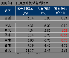 1~11月水泥銷售利潤率為6.14%,同比提高0.24個百分點。六大區域中,西北地區銷售利潤狀況最好,為11.17%,增幅也最大,同比提高5.68個百分點;西南次之,為9.19%;東北地區利潤率為4.54%,同比下降1.28個百分點;華東和中南地區銷售利潤率略微下調,分別為5.14%和6%。