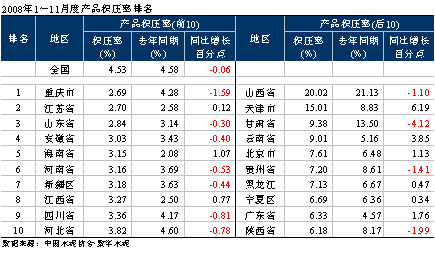 水泥產品積壓率最低前10的地區均在4%以下,較上個季度又有所降低:排名第一的重慶,由于本地市場需求旺盛以及受四川災后重建啟動影響;而山東、安徽等很多地區的企業及時調整生產節奏,控制庫存,面對市場下行的趨勢有效地解決產品積壓的問題。水泥產品積壓率最高的前10地區中,山西省以積壓率20.02%為最,比2007年同期微降1.10個百分點。