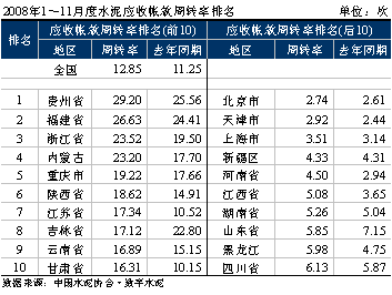 隨著銷售收入的快速增長,1~11月應收賬款有所上升,為366.51億元,同比上升了12.09%,上升幅度在合理范圍。應收賬款周轉率卻較2007年同期加快1.6次,達到12.85次[1]。在應收賬款周轉率排名前10的地區中,貴州的應收賬款最低為5.41億元,周轉率29.20次,居全國首位,較2007年同期提高13.82次;浙江和江蘇的應收賬款周轉率較高,分別為23.52次和17.34次,說明沿海的水泥大省對資金回收非常重視。