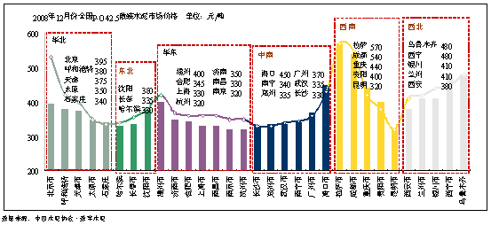 截止2008年12月,根據數字水泥網對全國31個城市水泥價格的跟蹤情況顯示,全國水泥市場平均價格P.O42.5散裝383元/噸,與2007年同期325元/噸相比,增長17.64%。增長幅度最大的是西寧、銀川、重慶、蘭州和濟南,均在40%以上。