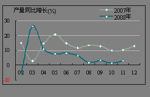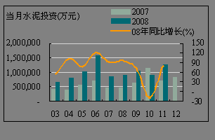 水泥投資在11月扭轉了10月份的同比增長速度探底,當月投資12.56億元,環比增長37.47%,與07年同比增長80.61%