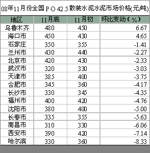 11月全國水泥需求仍舊疲軟,未能出現往年量價齊升的情況。以P·O 42.5 散裝水泥為代表的價格整體繼續小幅下降,價格上漲城市由10月的4個減少到2個。只有烏魯木齊和?谑袃傻氐膬r格環比上漲,其中烏魯木齊每噸上漲了30元,漲幅接近7%。