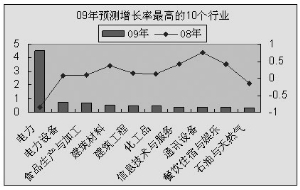 2009年預測盈利增長率前三位的,分別是電力、電力設備和食品生產與加工行業,增長率依次為452.44%、71.46%和67.02%。其它進入前十名的還有,建筑材料、建筑工程、化工品、信息技術與服務、通訊設備、餐飲住宿與娛樂和石油與天然氣等行業。