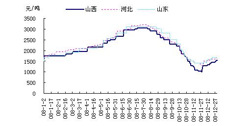 2008年焦炭市場價格在需求、原料煤價的帶動下,經過7次漲價,從年初的1700-1800元/噸漲至7月份的3200-3300元/噸,漲幅達80%;隨后,由于鋼材市場逐漸走低,對焦炭需求不旺,焦炭市場出現產品滯銷的局面,一些焦化企業為了回籠資金,相繼降價“跳水”促銷。截止12月底山西地區二級冶金焦價格在1500-1550元/噸(詳見圖13-3),較上半年最高點回落1500元/噸,較年初跌50-100元/噸。河北地區二級冶金焦價格在1650元/噸,較上半年最高點回落1500-1550元/噸,與年初相比基本保持穩定。山東地區二級冶金焦價格在1650元/噸,較上半年最高點回落1400元/噸,較年初漲100元/噸。