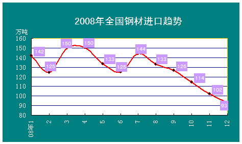 2008年1-8月份我國鋼材進口量在125-150萬噸上下波動。自7月后,隨著國內下游終端需求的低迷,特別是家電、造船、汽車業的不景氣,我國鋼材進口量連續下滑,由7月的144萬噸降至12月份的93萬噸,降幅35.4%。
