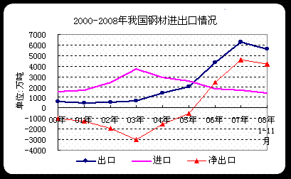 進入本世紀以來,我國鋼鐵投資熱情高漲,產能快速擴張,粗鋼年產量很快突破4億,2007年達到4.89億噸,占全球粗鋼產量份額倍增,從2001年僅為18%到2007年則為37.2%。國內產量增加、國際需求強勁以及可觀價差等因素的刺激下,我國廠商積極進軍海外市場,對外貿易量高速增長,2005年鋼材出口超過2000萬噸,坯材折粗鋼凈出口13萬噸,2006、2007年這一數據則分別達3442和5444萬噸。強勁出口使得鋼材很快實現貿易順差,2006年順差額為64億美元,2007年則升至236億美元。
