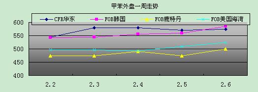 本周甲苯外盤價(jià)格較上周末各地價(jià)格有所增長。在CFR中國市場(chǎng),由于場(chǎng)內(nèi)受到二甲苯在中國需求影響,下游對(duì)二甲苯供應(yīng)緊張,所以甲苯價(jià)格被進(jìn)一步的推漲。周末亞洲CFR中國收盤價(jià)在574.5-575.5美元/噸,較上周末上漲了34.5/25.5美元/噸,F(xiàn)OB韓國:584.5-585.5美元/噸,與上周末價(jià)格相比,上漲了69.5/65.5美元。歐美國家,市場(chǎng)商談氣氛也有所回暖,但是實(shí)際成交依舊不多。FOB鹿特丹:498-502美元/噸,上漲了53/42美元;FOB美國海灣:464-494美元/噸,上漲了58/31美元。