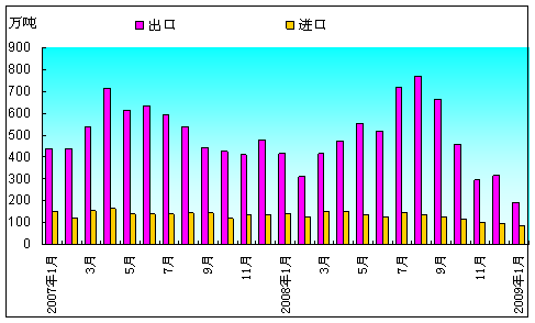 首先我們不得不考慮的因素就是春節(jié)假期。我們先來看一組數(shù)據(jù),今年1月我國各種商品進(jìn)出口總值為1418億美元,比去年同期下降29%。其中出口904.5億美元,下降17.5%;進(jìn)口513.4億美元,下降43.1%。雖然從總值上看,今年1月份進(jìn)出口繼續(xù)下降,但剔除春節(jié)因素后外貿(mào)出口有所增長。今年1月份比去年1月份少5個(gè)工作日,如果剔除工作日的影響,1月份的出口值比去年同期增長6.8%。鋼材出口同樣受春節(jié)因素影響。2008年春節(jié)是在2月份出現(xiàn)的,同月我國鋼材出口量也出現(xiàn)了較為明顯的下降。據(jù)蘭格鋼鐵信息研究中心監(jiān)測(cè)的數(shù)據(jù)顯示,2008年2月份我國鋼材出口量310.75萬噸(詳見下圖),比2008年1月份減少102.31萬噸,隨后3月份出口量達(dá)到了415.02萬噸,比2月份增加了104.27萬噸,基本恢復(fù)到了當(dāng)時(shí)的正常水平。春節(jié)假期的確對(duì)1月份鋼材出口產(chǎn)生了比較大的影響。如果剔除春節(jié)因素影響,1月份我國鋼材出口量同比減少128萬噸,同比降低40.18%;環(huán)比減少43萬噸,環(huán)比降低18.51%。